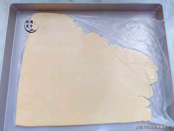 步驟三:把黃油、低筋粉等混合物攪拌好瞭之後,用搟面杖搟成薄薄的餅狀,大約厚度為3毫米左右即可。搟成薄餅後用保鮮膜或者保鮮袋包裹上,放入冰箱冷凍10分鐘左右。