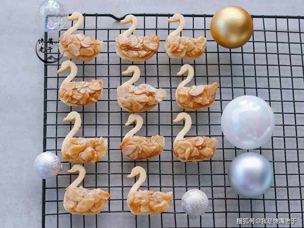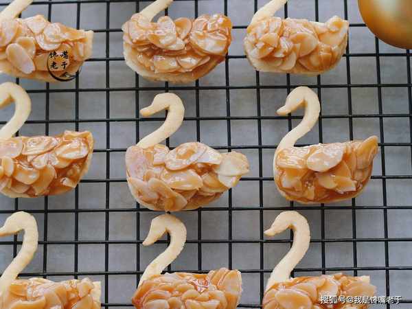 步驟五:熬好杏仁片後,用小勺子將焦糖杏仁片舀在天鵝的肚子上,然後靜置冷卻凝固在一起後即可食用。