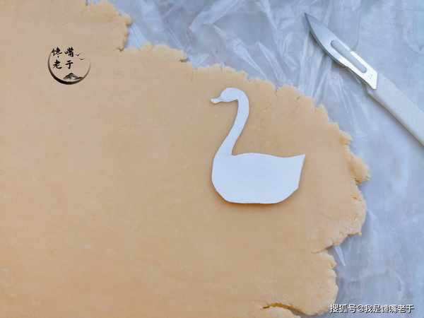 步驟四:冷凍面胚的時候,找個幹凈的硬紙殼,剪出一個天鵝的樣子(有模具更好)。等面胚冷凍到時後取出,把天鵝的模子放在面胚上,用小刀順著模子劃出天鵝的輪廓後取出備用。