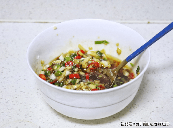 3、蒜瓣去皮切末,小米椒切圈,放入碗中備用。鍋裡加入適量食用油,加熱至冒煙,倒入料碗中熗出香味,加入食鹽、生抽、米醋、蠔油、白糖、雞精、香油,用筷子攪拌均勻。
