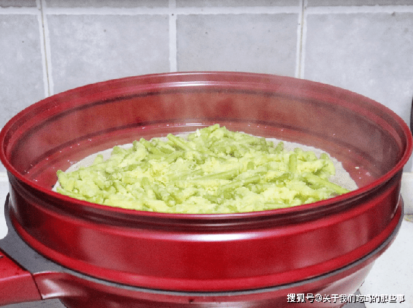 2、蒸鍋加水燒開,鋪上籠佈,倒入處理好的蒜薹段,鋪均勻後蓋上蓋子蒸10分鐘,關火後取出晾涼,抖散備用。