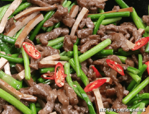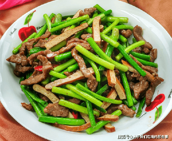 準備牛裡脊肉、蒜薹、玉米油、食鹽、生抽、料酒、蠔油、黑胡椒粉、生薑、紅辣椒、豆腐幹。