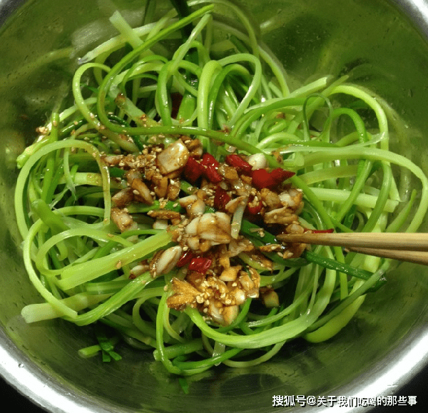 2、蒜瓣去皮切末,幹辣椒切段,放入碗中加入一勺白芝麻,用熱油潑一下熗出香味,加入適量食鹽、生湊、香醋、白糖、香油攪拌均勻,澆在蒜薹絲上拌均勻即可。