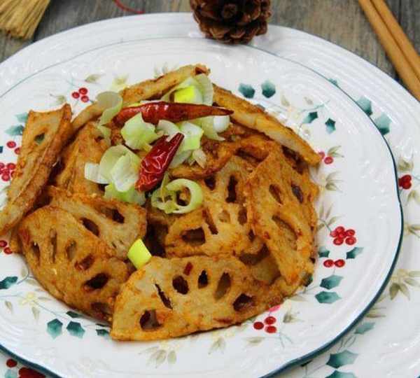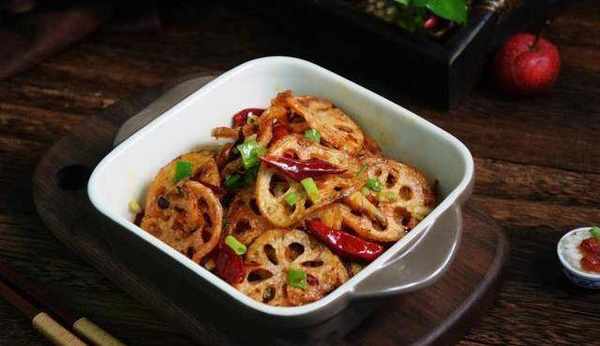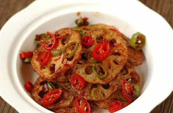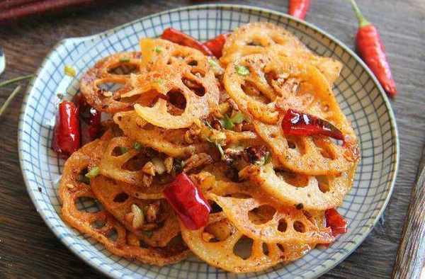 鍋內倒油加熱,油溫熱後分批放入藕片炸至金黃色,將炸好的藕片撈出在一邊瀝油。再次熱油鍋,放入1勺辣椒醬煸炒一下,然後把辣椒醬盛出碗裡,加生抽、糖、鹽調勻。再加少許油在鍋中,倒入蒜末爆香,放入幹辣椒煸炒。倒入炸好的藕片,翻炒均勻。
