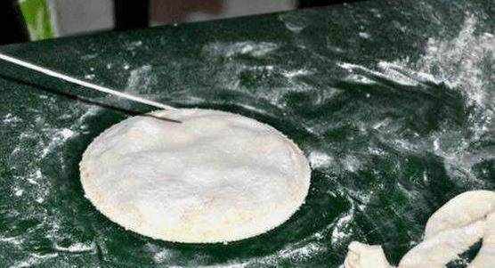 這樣就成瞭一個均勻的圓形,然後圍著邊兒捏上褶,防止側漏,再把兩面拍滿面粉,這樣下鍋烙好後,餅皮不容易發黑。