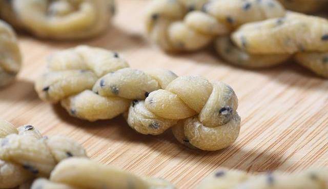 首先在大碗中倒入500克的面粉,根據自己的口味加入適量的鹽,在打入三顆雞蛋,先用筷子把雞蛋攪散,然後再加入適量的清水,邊加邊攪拌,攪拌至沒有幹面粉的時候,加入15克的黑芝麻,然後再倒入80克的玉米油,下手揉成面團,黑芝麻不宜放得過多,不然會影響後面的操作。揉好以後蓋上保鮮膜,醒面半個小時,面寫好之後轉移到案板上,在案板上撒點幹面粉防粘,把面團充分的揉勻,摟好之後用手掌按扁,再用搟面杖搟成厚度,約一厘米的長方形面片,搟好之後再給它切成面條,取出一根面條把它搓成細條,搓成小指粗細就可以瞭。