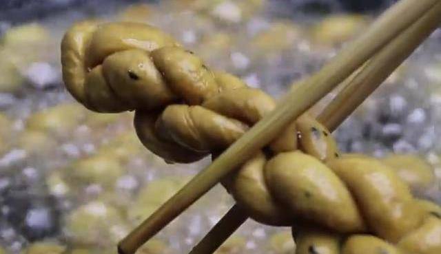 然後一手向上,一手向下,像這樣給它擰上勁,然後把它們重疊到一起,按住一端,像這樣再給它搓上勁,然後再拿起來把這兩個扭到一起,再把頭部的地方套在裡面,像這樣一個麻花生坯就做好瞭,把剩下的全部做完,然後起過燒油,鍋中多倒點油,用筷子試一下油溫,筷子周圍有密集的小氣泡就是可以瞭。