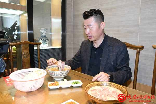 陜西寶駒軒餐飲管理有限公司董事長王耀紅介紹特色美食驢肉泡饃。記者 王清 攝
