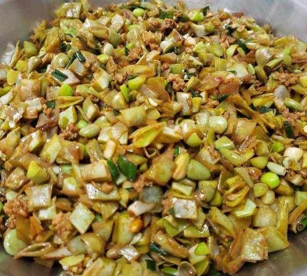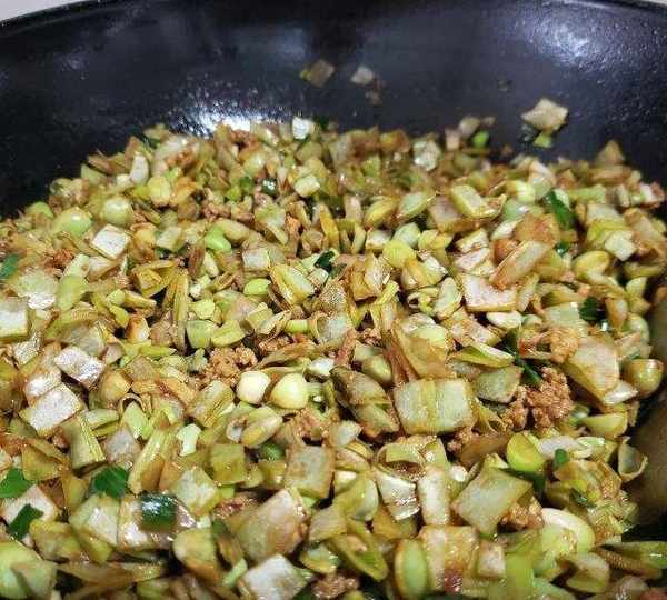 第5步、鍋燒熱放適量油,倒入肉餡和老抽翻炒一下,再倒入蒜、蔥和梅豆加鹽調味,翻炒幾下即可。