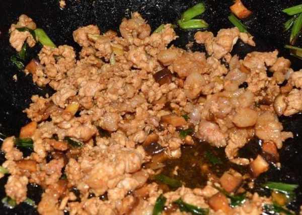 第四步:在平底鍋中加熱油。油燒開後,加入蔥花和辣椒,翻炒出香味,然後倒入豬肉碎。