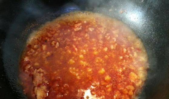 第三步:將蒜末和豆瓣醬放入鍋中,小火翻炒2分鐘,加入肉末,將肉末炒熟。