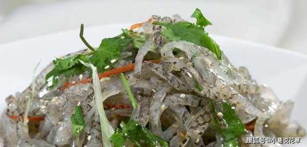 小貼士:魚皮的口感很有彈性,一點魚腥味都沒有。冷沙拉是最好的吃法。魚皮不要加熱,因為加熱後會融化,變得非常柔軟無味。所以不要把熱油倒在涼瞭的魚皮上,加調料拌勻即可。