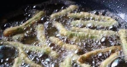 第五步:鍋中倒入少許食用油。油燒開後,放入裹在面團裡的豆子,炸至微黃,撈出驗油裝盤。