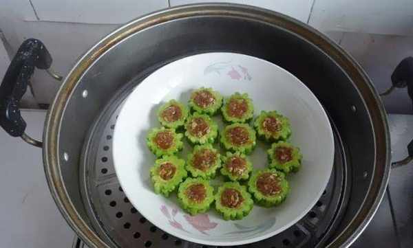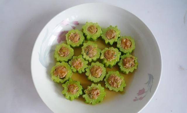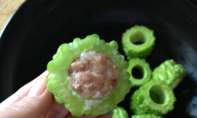 第三步:然後把拌好的肉餡填入苦瓜裡,把苦瓜的各個部位都填滿肉餡,填餡的時候一定要均勻,這樣口感會更好。一切都包好後,將苦瓜放入蒸鍋中,然後用大火蒸10分鐘左右。蒸好後撈出苦瓜。