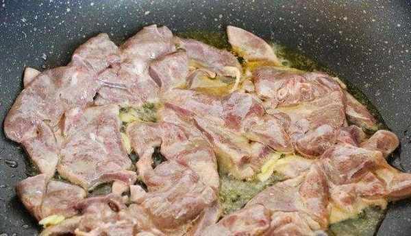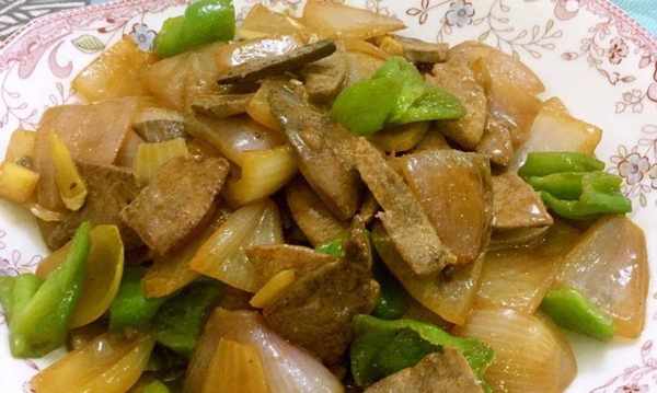 第三步:鍋裡放油燒熱,放入豬肝,油燒開後,翻炒至豬肝變色,加入洋蔥炒勻。