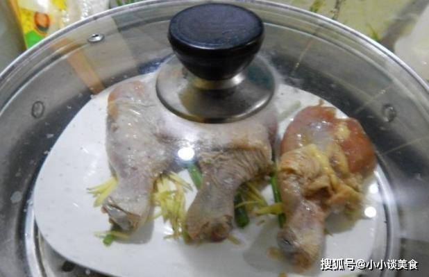 第四步:將盤子放入蒸鍋,大火煮沸,蒸30分鐘。蒸好後取出雞腿,用冷水浸泡1小時。