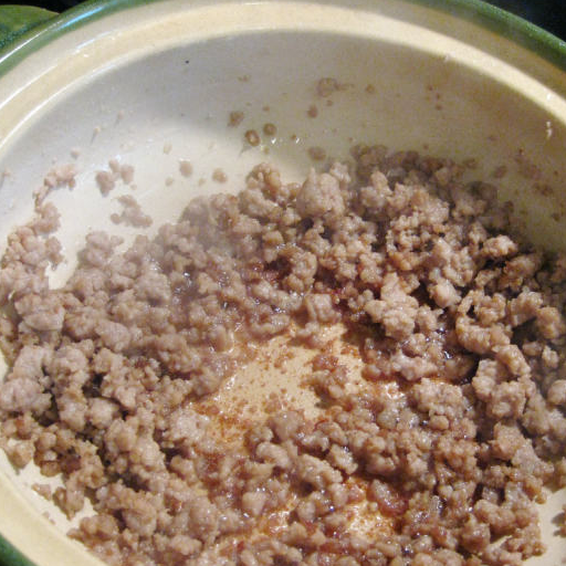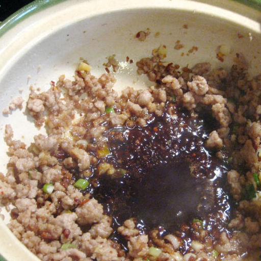 第4步、砂煲放底油,中火燒熱,放入肉末不斷撥散和均勻,不要讓肉成團,煸至煲底有焦的感覺;