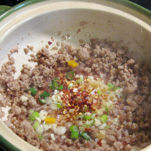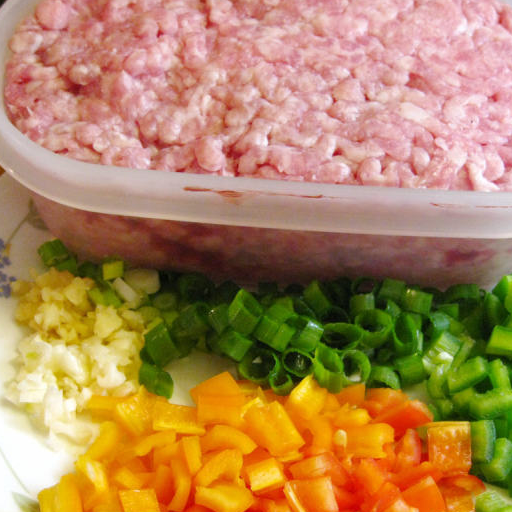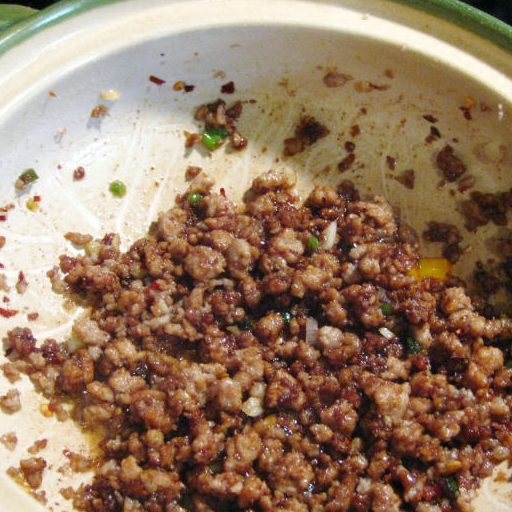 原料:肉末、粉絲、蒜茸、薑茸、紅椒末、橙椒末、青椒末、蔥白粒、蔥綠粒、生抽、白糖、胡椒粉、白酒、菜油、炒肉醬、胡椒粉、生抽、白酒、麻油。