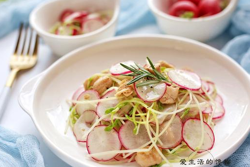 3,豌豆苗洗幹凈後放入開水鍋裡焯水,大約2分鐘,和蘿卜片加入少許鹽拌勻。