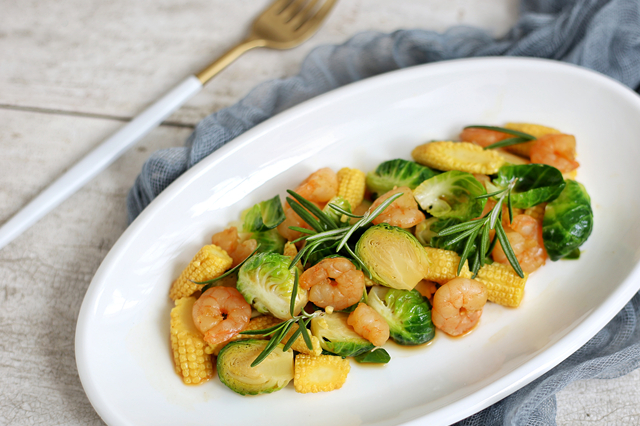 蝦仁50克,孢子甘藍50克,玉米筍4根,醬油10克,鹽1克,橄欖油1勺