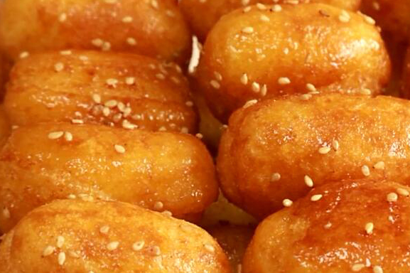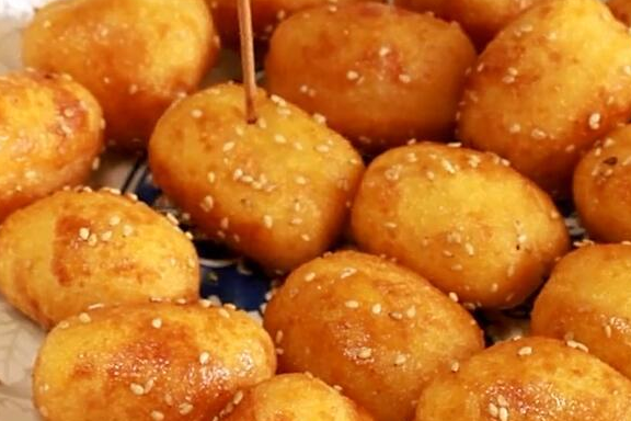 第四步:將炸熟的小面劑撈出來控油,放在盤中撒上適量的白芝麻,翻拌一下,就可以吃瞭,吃的時候用竹簽穿起來吃會更加方便的。