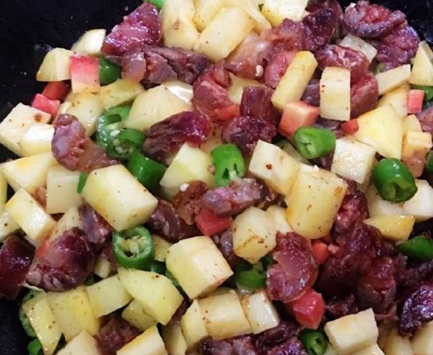 原料:大米、豆角、土豆、香腸、玉米粒、醬油。