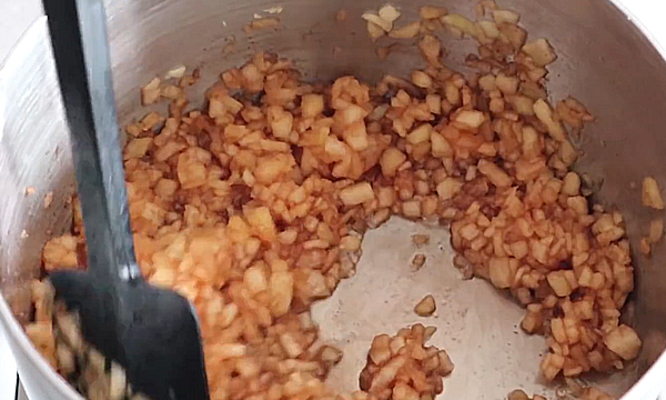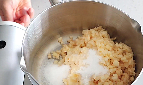 9.將切好的蘋果碎塊和糖放入小鍋中,在中火攪拌下將其加熱煮沸。當出現水時,加入肉桂粉。