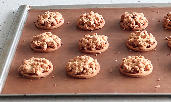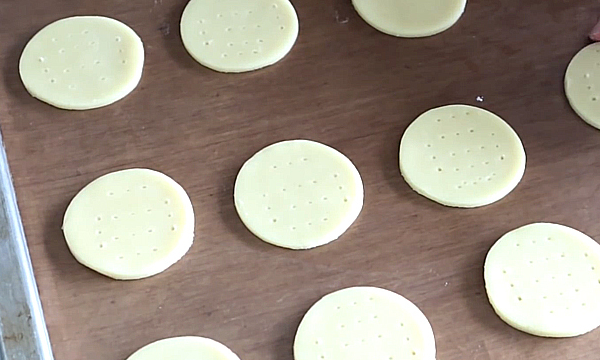 12.面皮搟好後,用圓形模具將他們切割好,在烤盤上放入冰箱冷卻一會。取出用叉子在面餅上做一些氣孔,以免餅幹在烘烤中破裂。