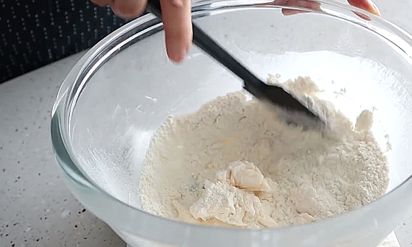 3.將蛋糕粉和杏仁粉過篩,倒入攪拌好的黃油中,用攪拌板將它們攪拌混合成面團。