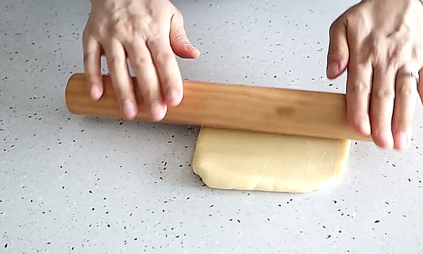 11.進入組裝階段,面板上撒上浮粉,用搟面杖將冷凍好的面團搟成大約0.3厘米厚(如果面團在加工過程中變軟不好操作,請將其放入冰箱冷卻一會在使用)。