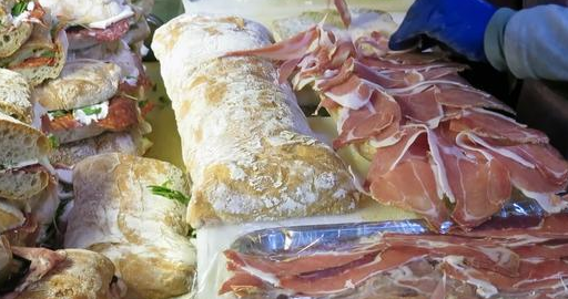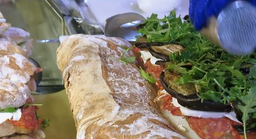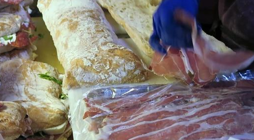 在把生火腿肉切成片之後,再把超級大面包剖成兩半。
