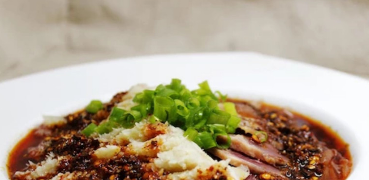 3、牛肉擺盤,放薑汁,澆上辣椒和花椒油。