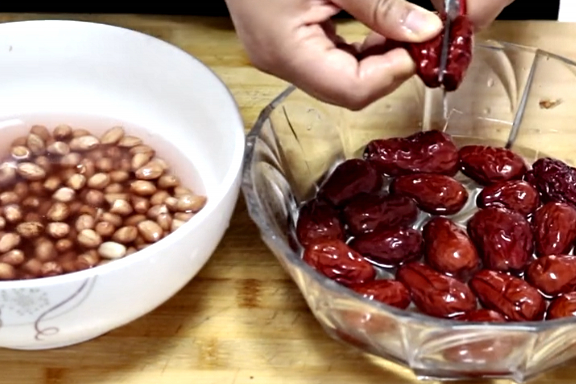 第三步:把大棗放在水中清洗一下,然後用剪刀,把大棗從中間剪開,再把花生米清洗幹凈(你也可以準備自己愛吃的幹果),在小盆中加上3勺白糖,再倒上溫水攪拌均勻,使白糖化開備用。