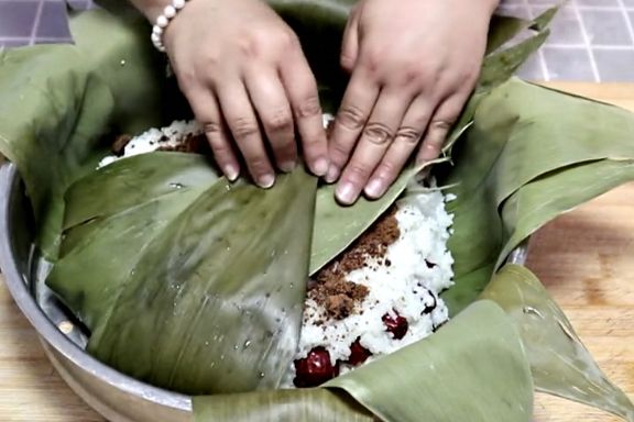 4:粽葉要記得擺放在蒸籠裡,粽葉與粽葉之間,不能有空隙,如果有空隙的話,糯米裡面的香味就會流失,最後把糯米鋪在裡面,熱水上鍋蒸15分鐘即可,時間到關火燜5分鐘就可以出鍋瞭。