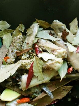 4.準備材料,茴香,花椒,桂皮,幹辣椒,八角,香葉,薑切片,蒜不切。鴨翅撈出來涼著。