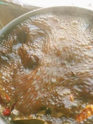 5.鍋中底油,把蔥、薑、花椒、桂皮、香葉、幹辣椒、八角爆香一下,然後倒入鴨翅,加油醬油,老抽翻炒幾下。