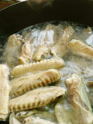 放入鴨翅,去掉血水,煮2分鐘,撈出浮沫。湯存留
