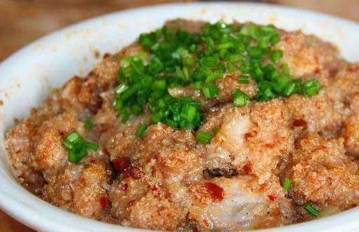 排骨裹上上面剩下的米粉,均勻鋪在土豆上面