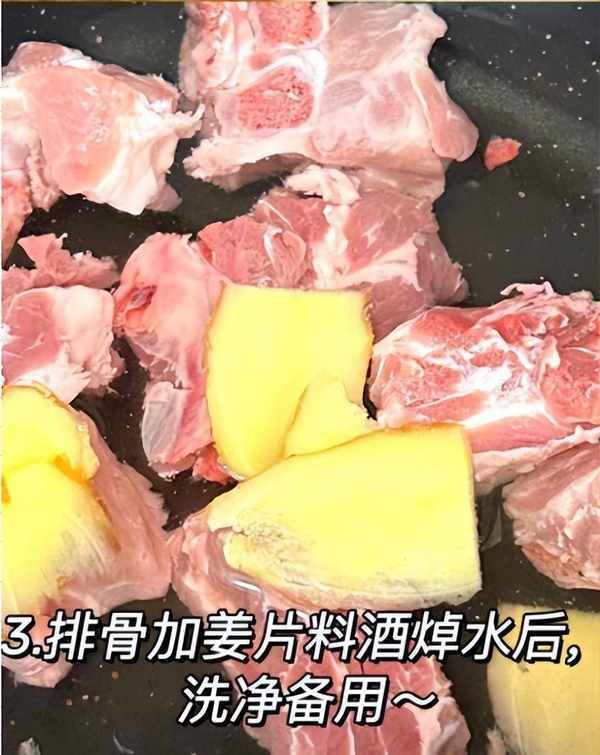 步驟4:將排骨都剁成塊狀,用流水反復沖洗幹凈,排骨放入鍋中,加上適量冷水,加上一些蔥結和薑片,開大火燉煮一會兒,將排骨焯水去腥處理。