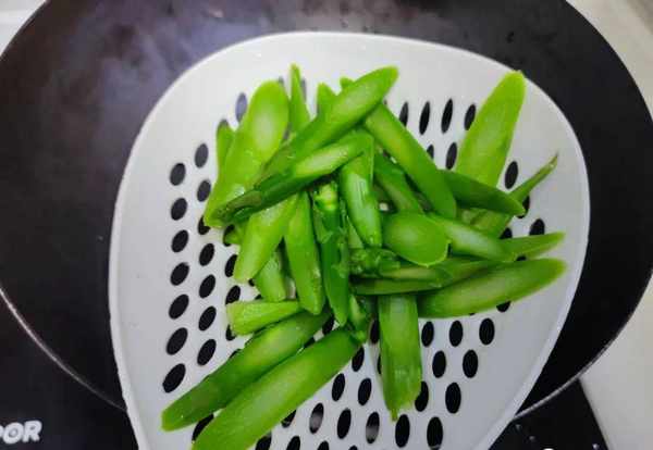 2.蘆筍洗凈切段,放在鍋中焯水,焯水後撈出。焯水的時間也要控制在1分鐘左右,煮的時間太長會煮老瞭,而且營養流失;
