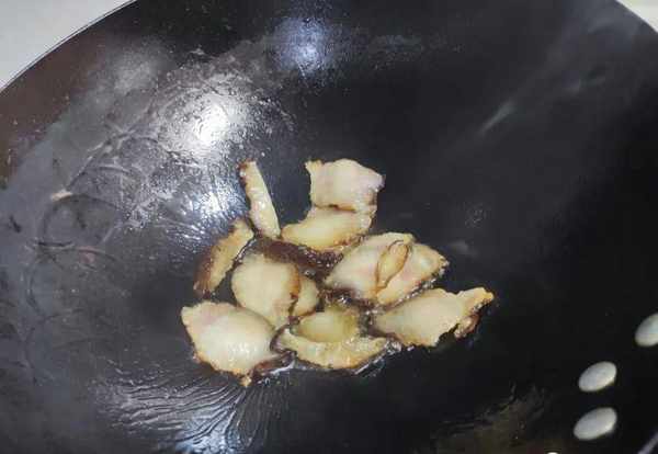 3.鍋中加入油,臘肉放入鍋中炒香,用小火煸炒。如果說臘肉相對肥厚,煸炒出臘肉裡面多餘的油脂,吃起來才會清爽;