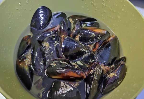 1.淡菜買回來洗幹凈,洗好的淡菜放在盆中,用剪刀將淡菜表面的須須去掉。新鮮的淡菜會有一些根須,可以處理好,焯水的時候也方便很多;