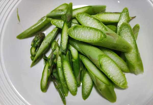 2.蘆筍正上市,水靈靈的,把蘆筍洗凈,切小段放在碗中。鍋內倒入水,水開後,把蘆筍放入,下鍋焯水1分鐘後撈出;