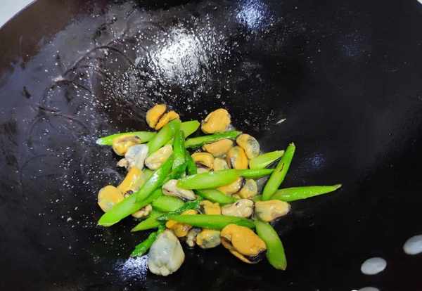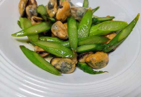 5.蘆筍下鍋炒1-2分鐘,可以清楚地看到它的顏色變得相對翠綠好看很多。這個時候,我們再把淡菜放入裡面,淡菜下鍋後,用鏟子多翻動,炒均勻。食材炒好後加入適量的食鹽,跟蠔油再調味炒均勻就行瞭。