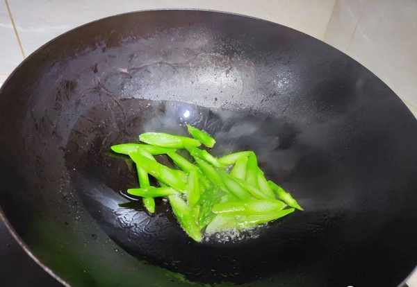 4.鍋中加入油,將焯水後的蘆筍倒入鍋裡面,下鍋後用鏟子翻炒均勻。炒蘆筍的時候用中小火炒就可以瞭,將鍋中的蘆筍炒個20秒鐘;翻蘆筍的時候,建議也要用鏟子多翻炒,這樣才不至於把蘆筍炒焦瞭;