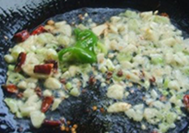 第四步:準備出來一個炒鍋,鍋中倒入適量的油,將幹辣椒,薑蒜末煸香,開始轉小火加入一匙料酒,兩匙醬油,再放入少許蔥花,開始攪勻。澆在蒸好的茄子上就完美結束瞭,響油茄子這道菜就這樣做好瞭。