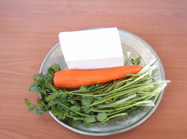 1、首先來處理一下食材,把豆腐用清水沖洗幹凈然後從中間一切為二,胡蘿卜削去外皮沖洗幹凈後切成長條狀,香菜擇洗幹凈(小舌頭這裡附上一個讓香菜味道更香的小秘訣,這個小秘訣很簡單,就是把香菜擇洗幹凈,瀝凈水分後,先用手搓一搓,把香味搓出來以後再切成小段,這樣香菜就會更香瞭);