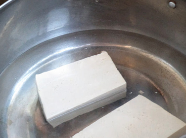 2、鍋裡放入足量的清水進去,然後開大火煮沸以後把我們切好的豆腐放進去簡單的焯水,不要煮太久大約需要3-5分鐘煮熟即可關火,然後把豆腐撈出來瀝幹水,最後等豆腐不燙手的時候把豆腐切成厚厚的長片,具體厚度根據個人愛好,小舌頭建議大傢不要切得太薄瞭,太薄的話筷子不好夾容易斷;