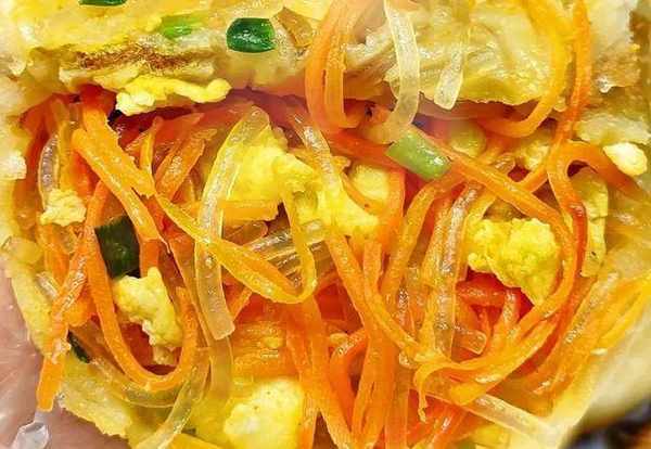1.胡蘿卜洗凈去皮,將去皮後的胡蘿卜擦成細絲。米粉放在鍋裡面,加入適量的水給泡一下。小蔥洗凈切段,鍋裡面倒入油,將油燒熱,我們把雞蛋放入油鍋中炒一下。2.雞蛋炒香之後,我們再把備好的胡蘿卜絲倒入裡面炒,加入少量的食鹽,胡椒粉,一點點的香油再給炒香。把備好的粉絲放入裡面,再炒個兩分鐘,餡料做完成。