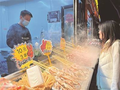 華燈初上,迎澤區老軍營東巷兩側的小吃店熱鬧非凡。沾串、龍蝦面等各種美食的香味撲面而來,銷售場面火爆;榴蓮餅、泰式椰子冰激凌等網紅名店打卡人數眾多,深受消費者喜愛。
